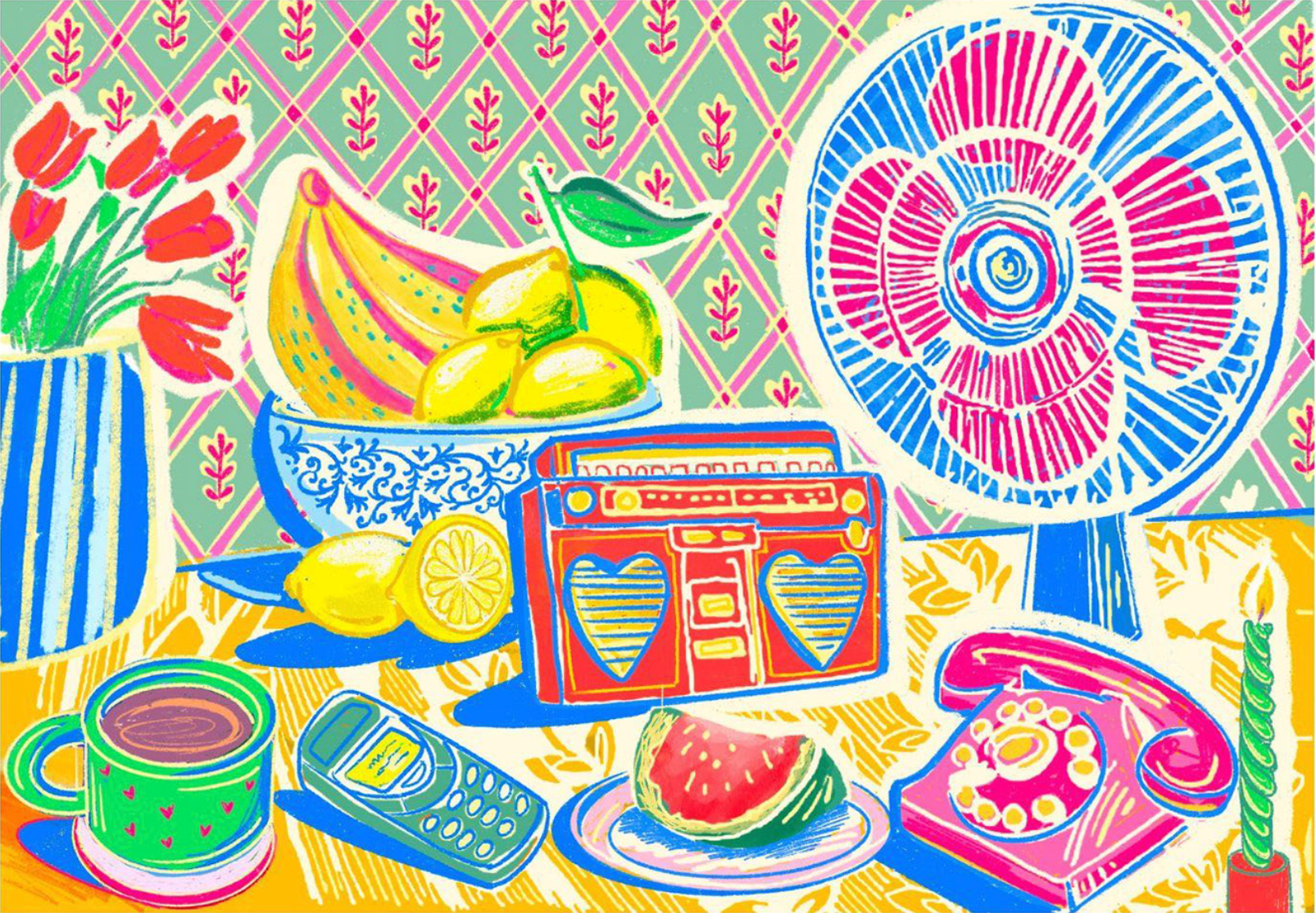 The old table fan hummed tirelessly, but on nights without electricity, we turned to handheld fans, waving them in sync while sharing stories in candlelight. A red radio crackled with Bollywood tunes, its melodies filling the humid air. The rotary phone sat untouched, waiting for the lines to come back. Fresh mangoes and watermelon offered a sweet escape, and a steaming cup of chai never lost its place, even in the heat. Those evenings, though inconvenient, were filled with laughter, resilience, and a slowness I now long for.